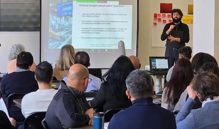 During the event, participants engaged with sample AI frameworks and selected from two rounds of breakout discussions featuring presentations, hands-on workshops, and collaborative conversations. The institute concluded with an activity centered on “second-order thinking” to help faculty analyze the broader implications of AI use.